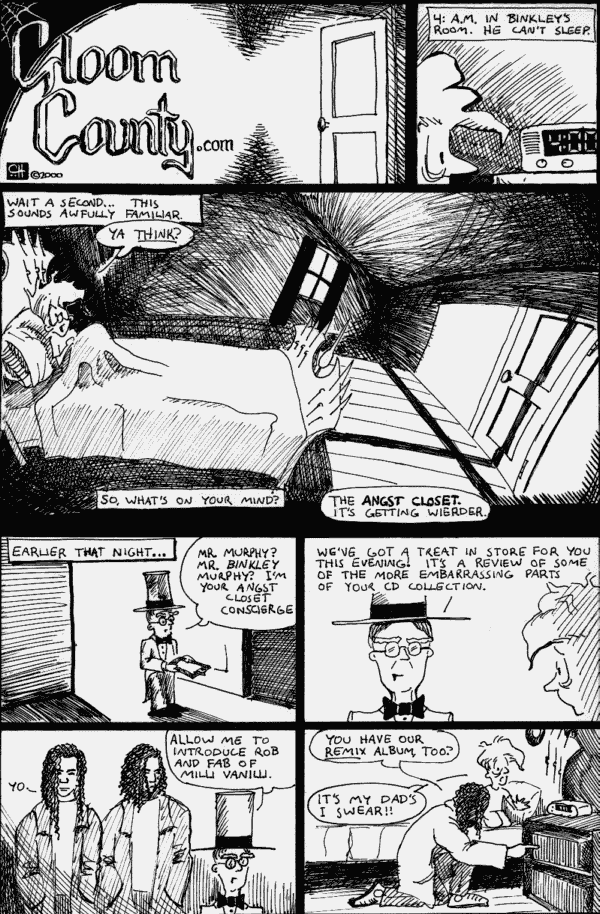 GloomCounty.com still needs artists! No one artist can single-handedly carry the awesome responsibility that is GloomCounty! (Bwa ha ha ha ha!) Seriously, though... if you, or anyone you know, would be interested in helping to create GloomCounty.com on a weekly or biweekly basis, please please PLEASE get in contact with me. I'd do it myself, but then Mopus would just be a stick figure with a big nose and Binkley would be a stick figure with tall hair.